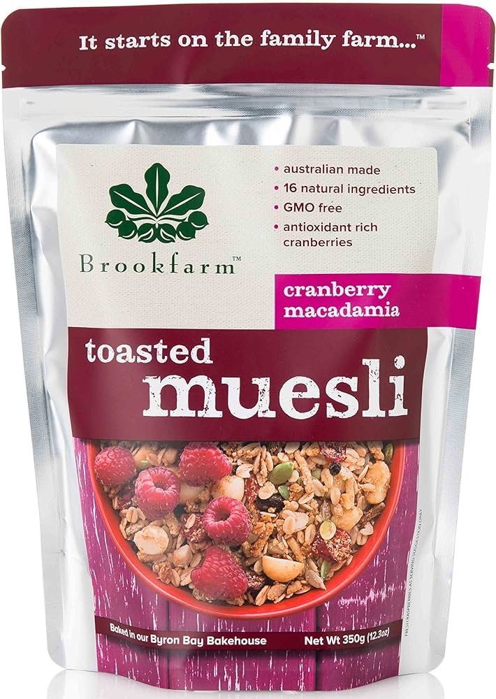 Brookfarm Toasted Macadamia Granola is a crunchy, golden granola featuring Byron Bay macadamias, toasted coconut, and Australian honey. Slow-baked for a satisfying crunch. Perfect with yoghurt, fresh fruit, or as a topping for smoothie bowls. Made on the Brookfarm property in the Byron Bay hinterland. 500g bag.