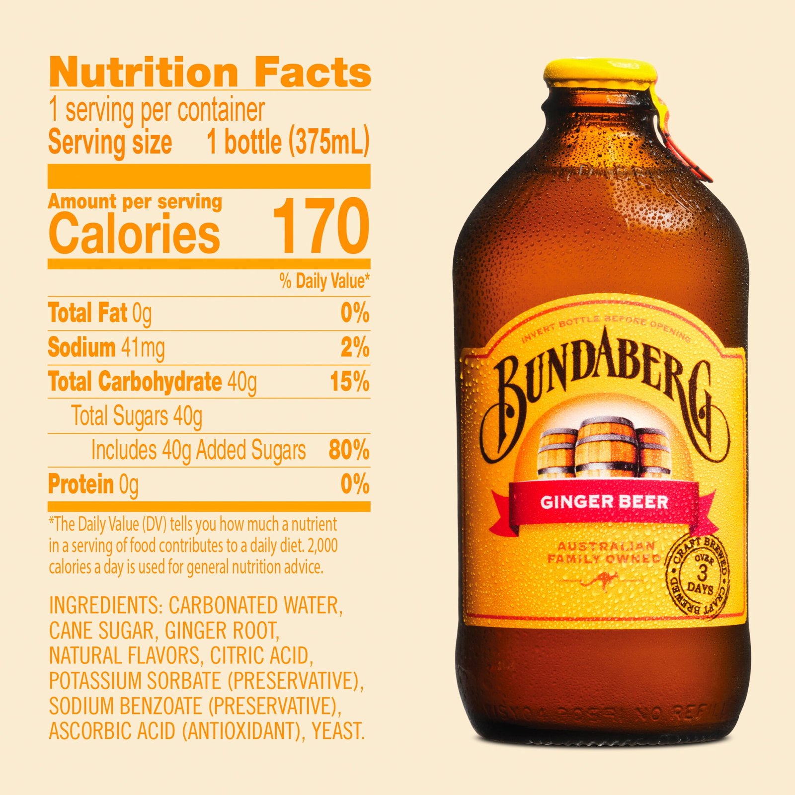 Bundaberg Tropical Mango 375ml is a craft-brewed sparkling drink bursting with the sweet, tropical flavour of Australian mangoes. Brewed over 3 days using real mango for an authentic taste. No artificial colours, flavours, or preservatives. Perfect for summer barbecues and picnics. Best served chilled.